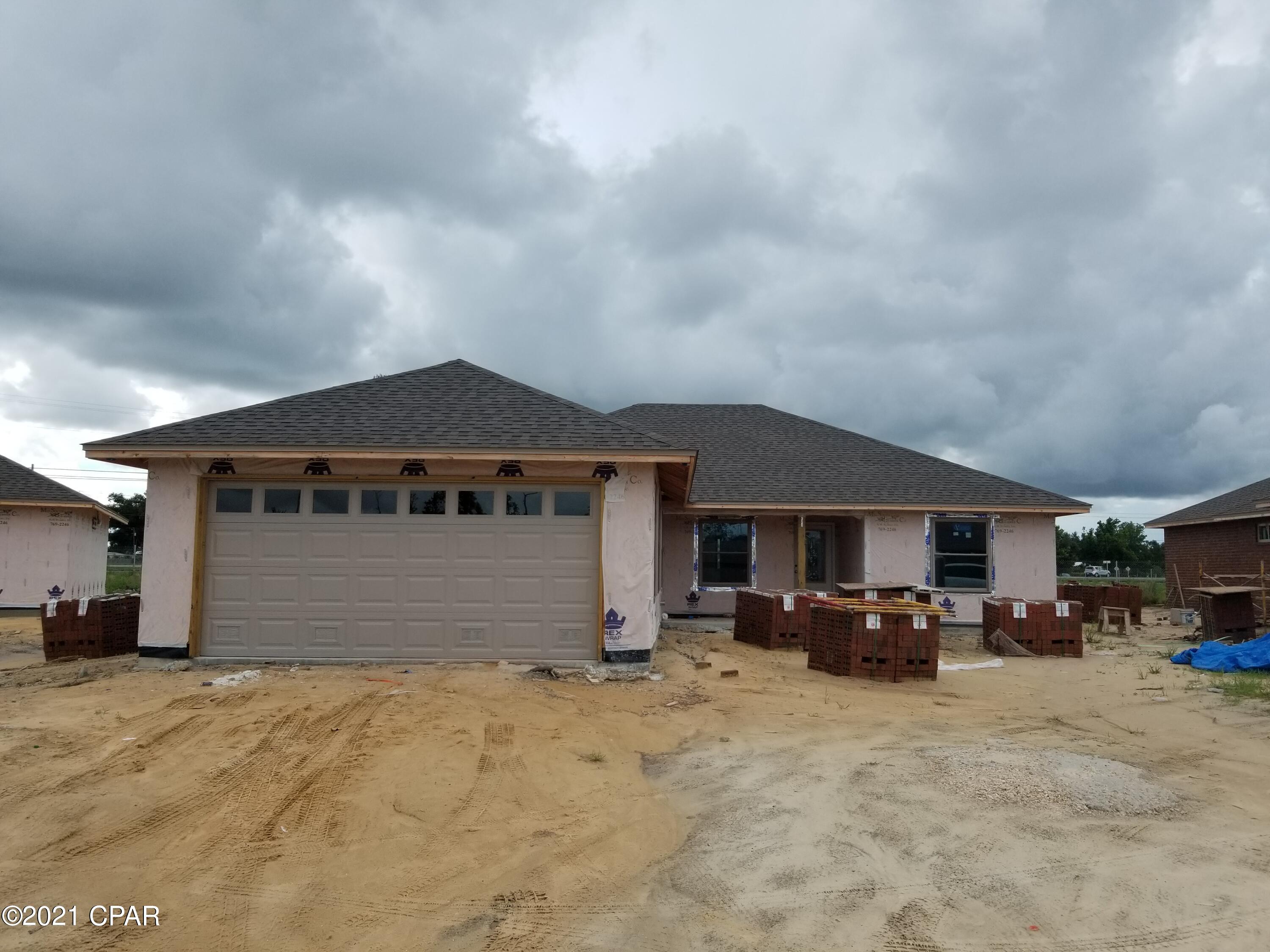 Under construction, luxury 3 bedroom 2 bath all brick home that offers large open floor plan, master bath with his & hers double shower with Rain maker (3 shower heads) and shower seat, double vanity, large master bedroom with built-in rope lighting, office room and large walk-in closets. The kitchen is a dream with all real hard wood cabinets, granite countertops, stainless steel appliances, cabinets in the laundry room. Living room with high tray ceilings with electric fire place, crown molding and wired for todays entertainment. Home comes with large Florida room, front porch, and open back porch, security system, thermoseal spry foam system and generator ready electrical outlet with cord. outside shower and sprinkler system. Hurricane built See pictures. Lock in price before it go up again. We use Simpson Tie down and corner tie down straps and brackets, walls bolted to foundation as well as 2+6 trusts. DP 50 windows, hip roofing just a few we do for a strong hurricane strength house. See pictures with out dry wall. Located in County not City offers lower taxes. About 4 months out from completion.