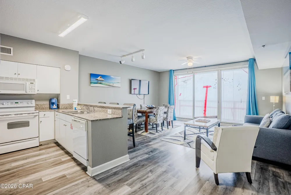 Welcome to Shores of Panama in beautiful Panama City Beach. This Gulf front 2-bedroom condo with additional hall bunks includes a highly sought-after assigned parking space and offers west-facing sunset views. From the private balcony, enjoy a direct overlook of the signature lagoon-style zero-entry pool surrounded by tropical landscaping, bridges, hot tub, and the iconic dolphin fountains. Inside, the condo has been recently painted and updated with durable vinyl plank flooring throughout. The open kitchen features granite countertops, a breakfast bar, and a pantry for extra storage. With 2 bedrooms, hallway bunk beds, and a sleeper sofa, this unit comfortably accommodates guests and is ideal for rental income or personal use. The floor plan includes three full bathrooms, providing added convenience for owners and guests. Resort amenities include the expansive outdoor pool area, two poolside tiki bars and a grill, an indoor pool and hot tub, a well-equipped fitness center, and an outdoor grilling/picnic area. Renovations to the building exterior are currently underway.